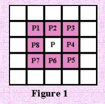 The Moore neighborhood of a pixel, P, is the set of 8 pixels which share a vertex or edge with that pixel. These pixels are namely pixels P1, P2, P3, P4, P5, P6, P7 and P8 shown in Figure 1 below.